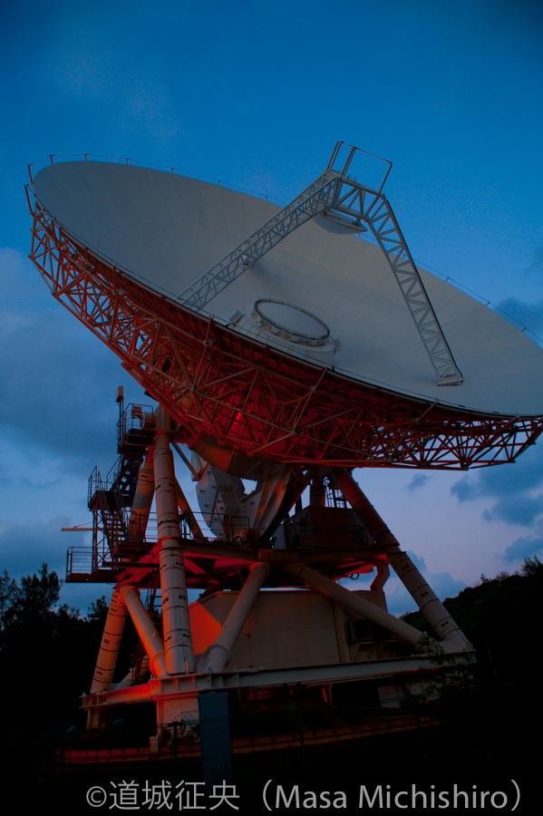小笠原諸島父島にある電波望遠鏡です。日本に何カ所かあるうちのひとつになります。夜になるとオレンジ色に灯されます。