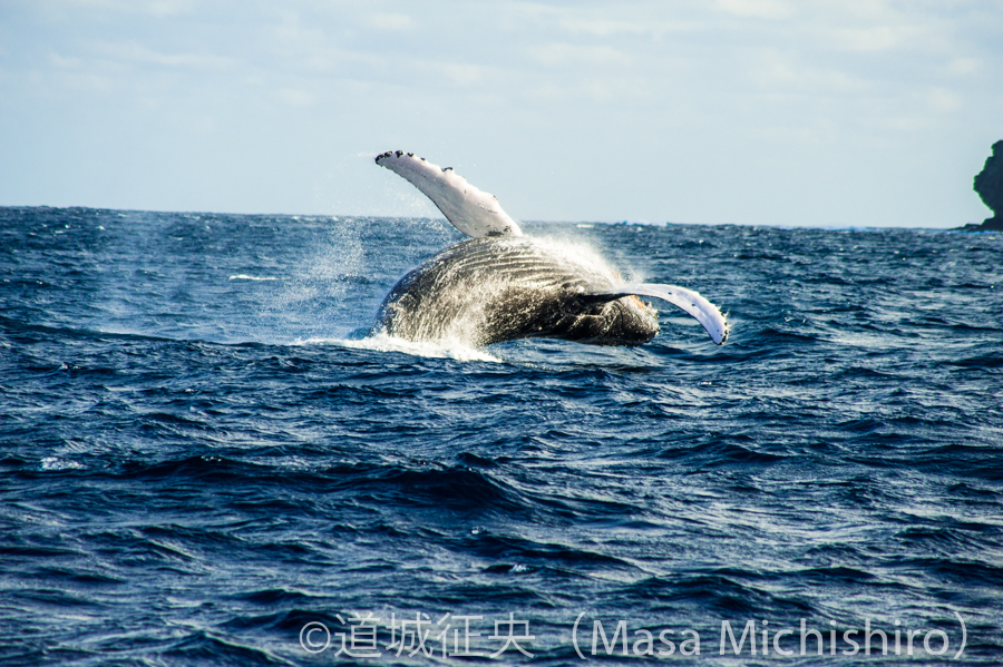 この時期の小笠原諸島の風物詩でもあります。親子のなかの子供のブリーチ(ジャンプ)ですが、やはり子供です。全身を出してジャンプすることはできませんでした。まだまだこの子供も憶えることが多そうです。