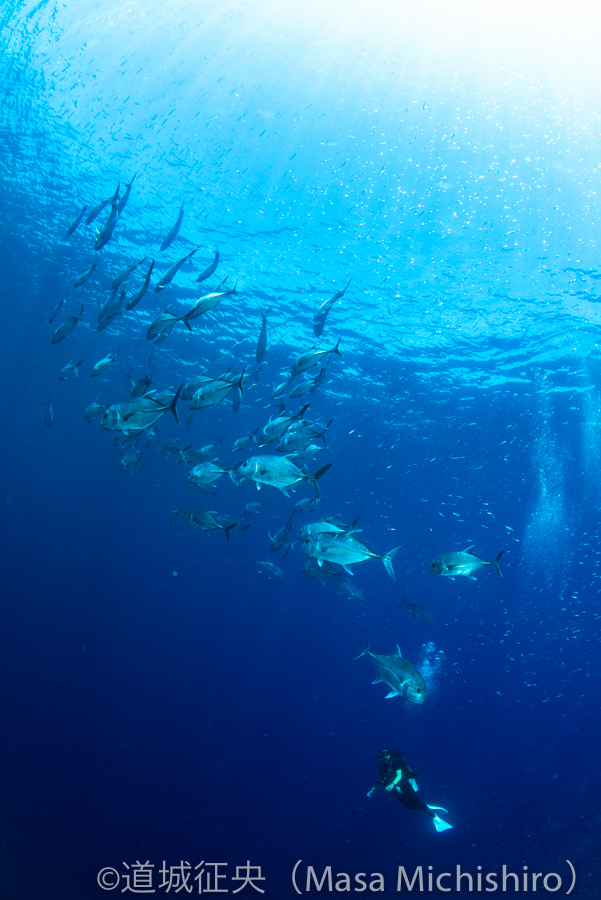 GT対ダイバー ロウニンアジとダイバーのツーショット。ロウニンアジとは釣り人の間では「GT」と呼ばれる大物の魚です。ここではご覧のように群れています。 公式Facebookページ セブ島放浪中の過去の写真