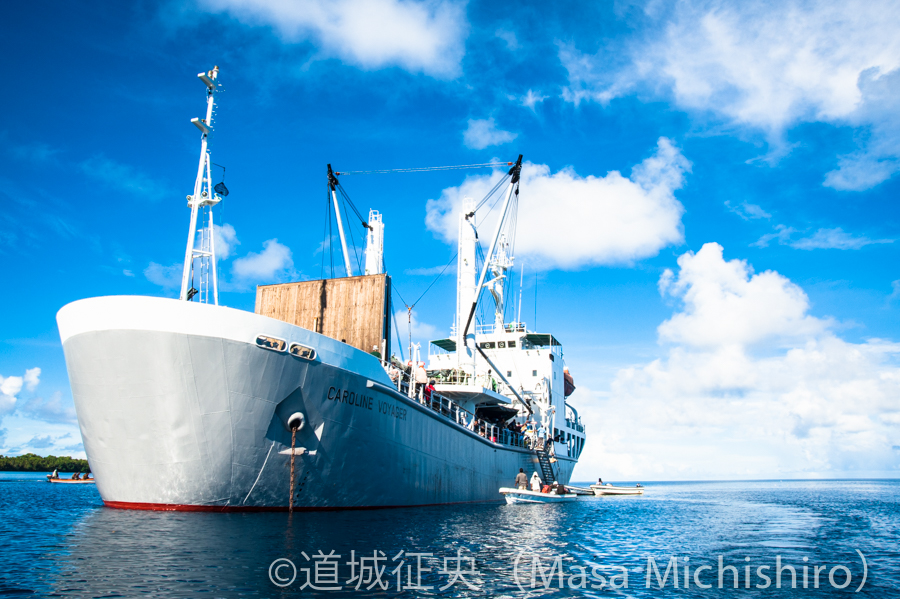 ポンペイから数ヶ月に一度の定期船「Caroline Voyager」で、往きは36時間、帰りは53時間もかかりました。定期船と言っても客船ではなく、ご覧のような貨物船のような船です。