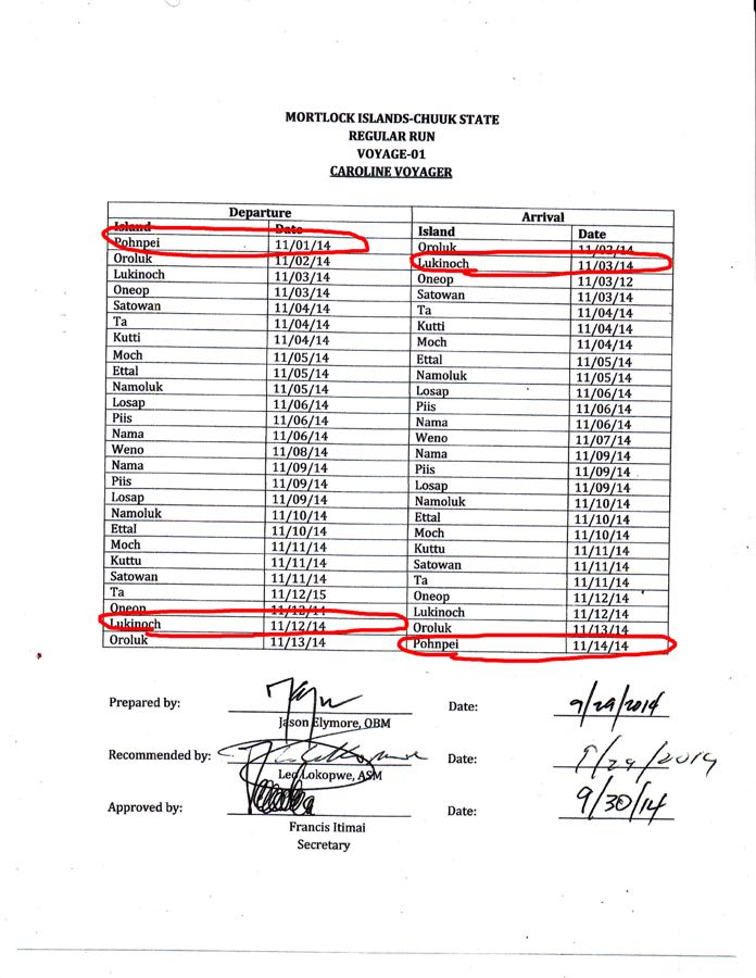 モートロック諸島ルクノール環礁に行く時は定期船「Caroline Voyager」を使います。その時刻表が添付です。赤マルが往き復り自分たちの乗船、下船した場所と日にちになります。
