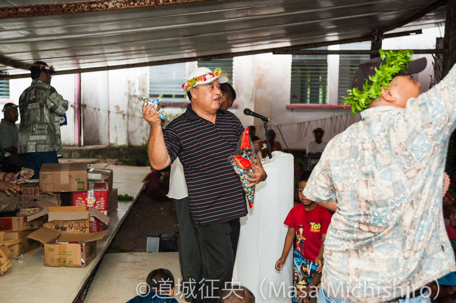 写真は村長就任式の模様です。写真は参加させてもらったルクノーチ村長就任を祝って子供たちは歌を歌います。モートロックの議員、チューク州の副知事、役人たちが列席者として参加しているのですが、子供が歌うと同時に議員たちはドル紙幣を払って、歌っている子供たちに向けてお菓子を写真のように投げまくるのです。左にある段ボールはお菓子の入った箱です。娯楽もマーケットもない島ですから、お菓子がまかれるだけで子供は喜びます。