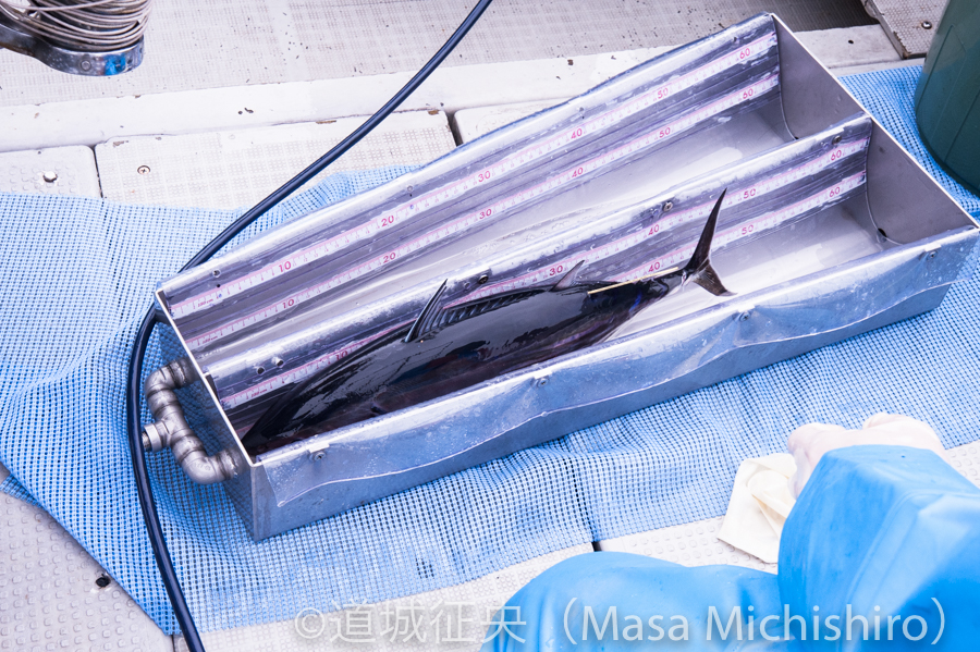 カツオの体へ発信器の埋込 カツオの回遊を調査するのにあたって、カツオの体に発信器を付けます。 カツオの背びれ近くに黄色い棒状のものが飛び出ていると思いますが、実際に差し込んだ状態になります。体調なども計測した後、海にかえします。 公式Facebookページ 味の素(株)の活動