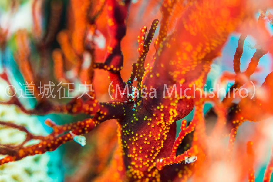 西表島で見たイソバナガニです。イソバナの幹の部分にいるので、非常に撮りづらいカニですが、何とかココまで撮ることができました。 いるということ、ちゃんとわかりますよね?擬態しているからわかりづらいかも知れませんが。