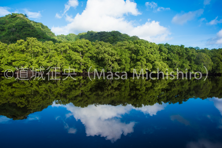 ミクロネシアのコスラエはマヤプシキというマングローブで囲まれた島です。 雨も多い島なのですが、天気が良いとこのように川面に映って見えます。