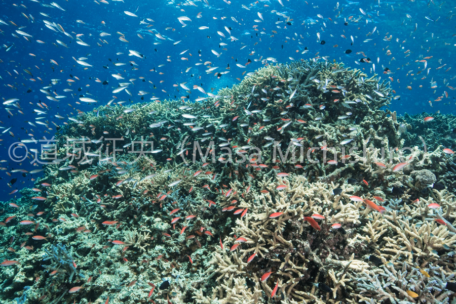 さて写真は小魚が群れる西表島のサンゴですが、どんな状態なんでしょうかね?