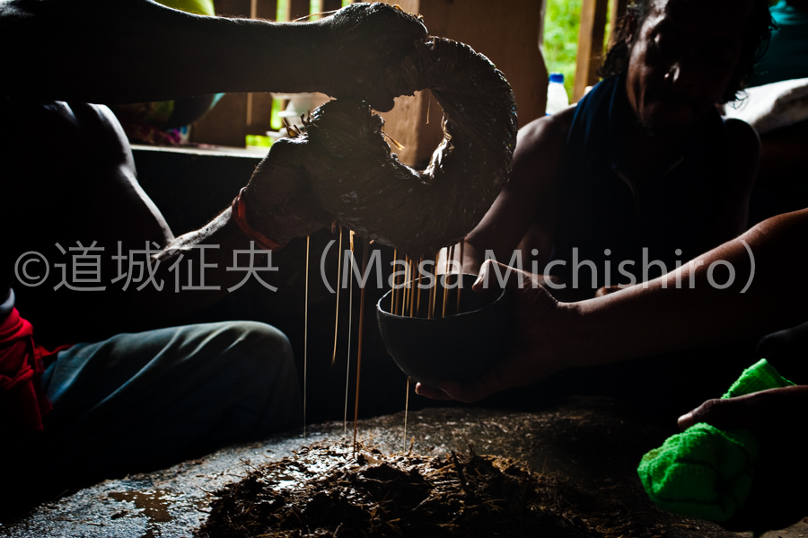 ミクロネシアのポンペイで飲まれている「サカオ」です。胡椒科の木の根っこを石の上で叩きつぶしてハイビスカスの皮で絞ると泥水のようなものが搾り出されます。
