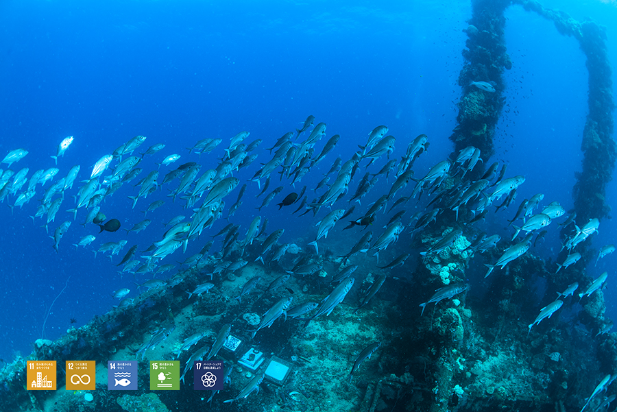 チューク諸島は世界的に有名なレックダイビング(沈没船ダイビング)のポイントです。写真はそこに沈む富士川丸とギンガメアジの群れです。船のデッキには75年前にこれらの船が沈められる要因になったトラック空襲のメモリアルレリーフが三つ並んで見えます。