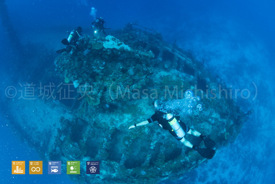ミクロネシア連邦チューク諸島に沈む「雲海丸」という日本の船です。下へと進んで行くと薄らと船影が見えてきます。その時は感動の一言ですね。