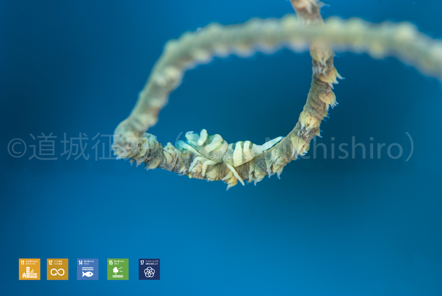 さてこのムチカラマツエビはムチカラマツという造礁サンゴと同じ六方サンゴ亜綱に属するれっきとした動物に共生する甲殻類です。ムチカラマツ自体潮通しの良いところに棲息しているので、それなりに揺れています。そこにミリ単位のエビが乗っているとピントが合わせにくいです。広い海の中、ごくごく小さな点を狙うダイビングも楽しいですよ。