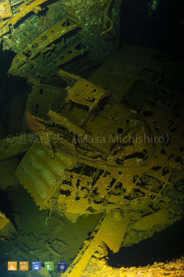 見た目何なのかわかりませんよね?海の中というのもわからない位です。これはミクロネシア連邦チューク諸島(旧トラック諸島)に沈む桃川丸と言う船です。その船内の一部です。先にあるのは旧日本海軍の飛行機の機体でしょう。船体も機体も朽ち果てていて、その対応も急がれます。