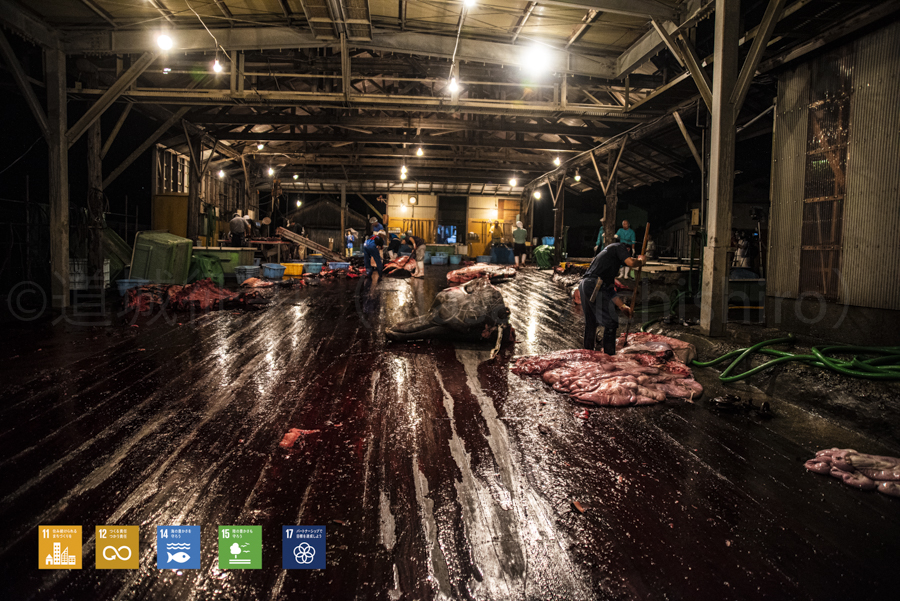 千葉県和田浦で見たツチクジラの解体現場です。もうほぼ部位ごとに解体された後で、真ん中には頭があります。こう言う写真を上げると解体関係者でなくても、海外からクレームの書き込みがあと聞いてビックリしています。ちなみに僕のところへは一度もないですね。