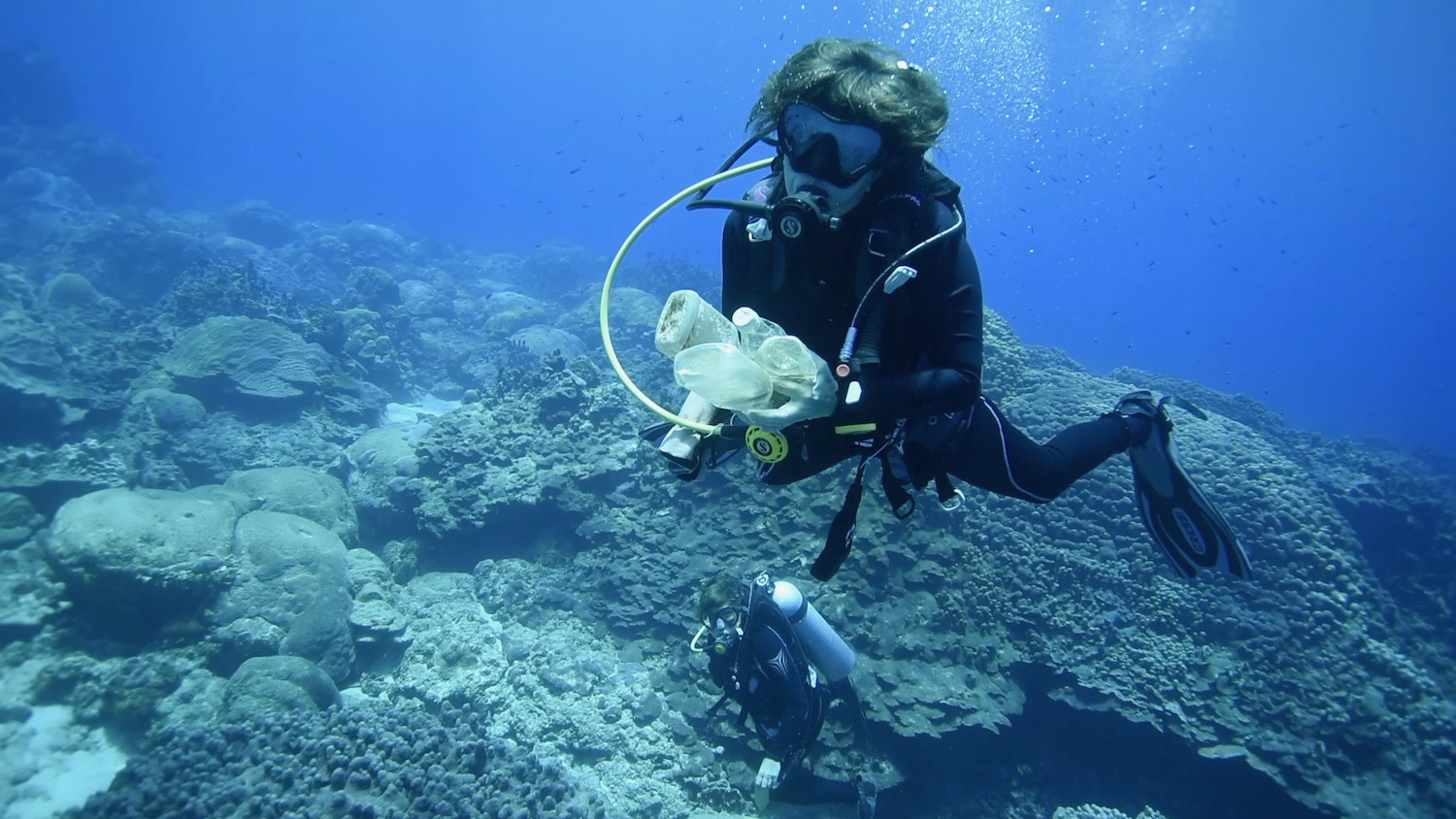 写真はミクロネシア連邦のコスラエ島で、カウンターパートナーのMariaがサンゴに引っかかっていたペットボトルを拾ってきたところ。