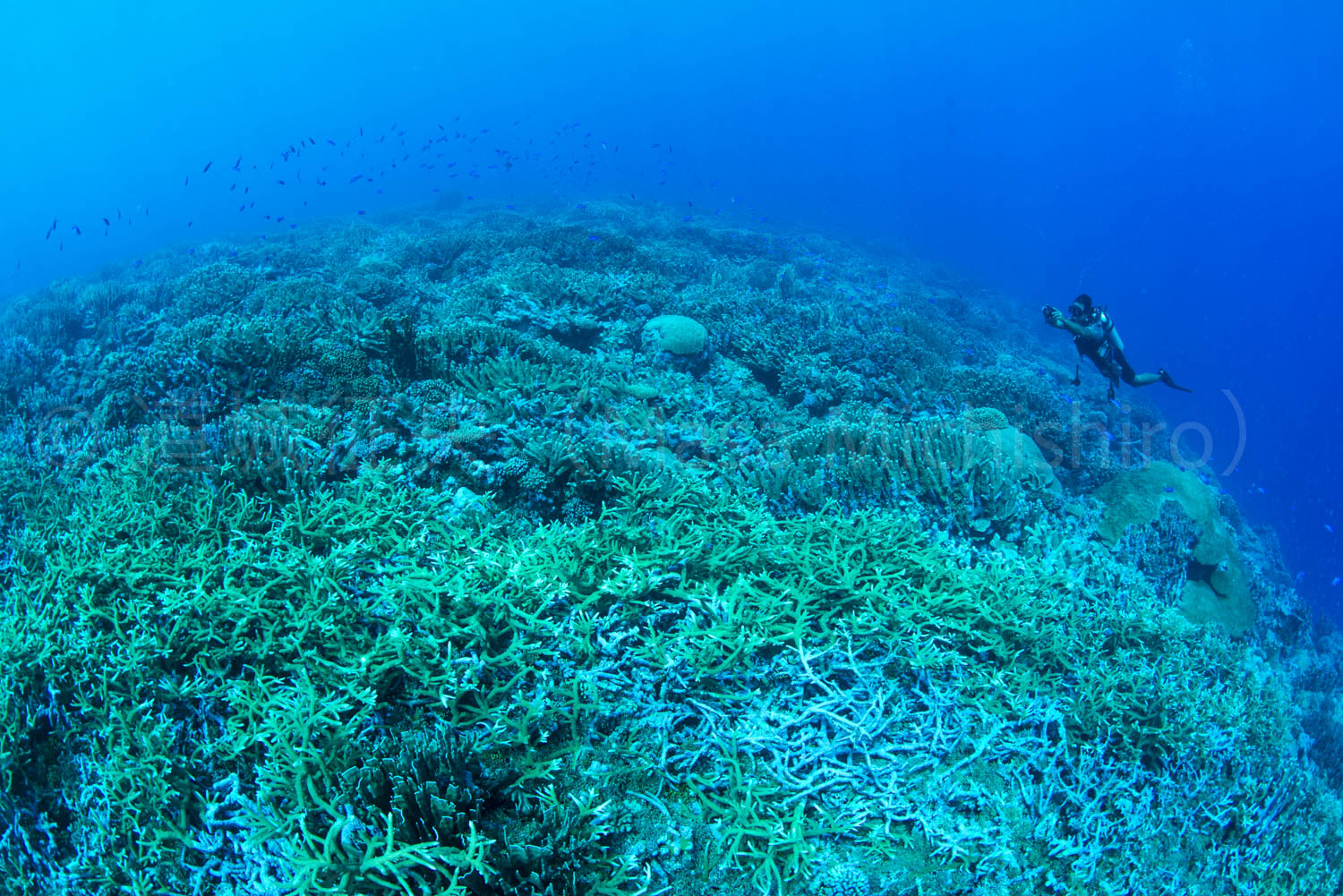 ダイビングポイントでない場所は人が入っていないだけに、サンゴも量も相当なものです。一面に広がり着底もできません。ここは礁斜面の手前であり、左側はまさに落ち込む礁斜面であります。