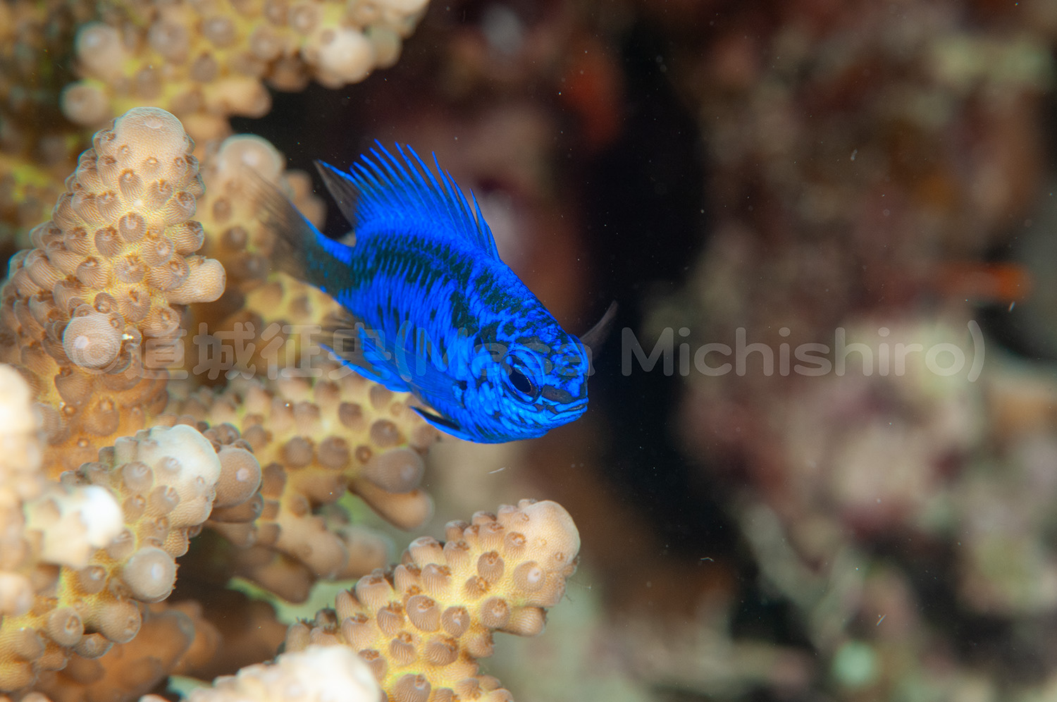 フィリピンのセブ島で見たローランドダムゼルです。青中心の単純な色合いですが、小さくて綺麗な魚です。また見てみたいですね。