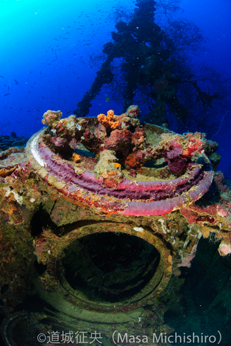 ミクロネシア連邦チューク諸島の環礁内に沈む「五星丸」という沈没船です。比較的水深も低い場所に沈んでいます。横倒しになっているこの船にサンゴが付着し、そこにスズメダイが群がっています。