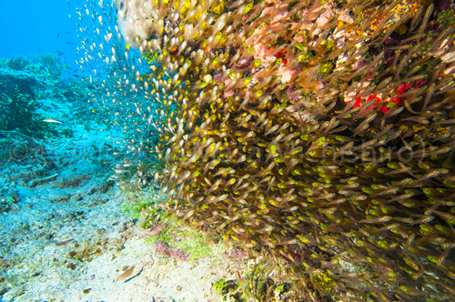 前回と同じクジャクスズメダイです。これもジープ島の近くに沈む沈没船にたくさん群れています。