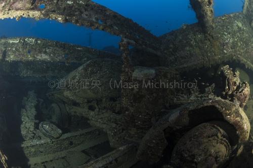 ミクロネシア連邦チューク諸島(旧名トラック諸島)に沈む「桑港丸」です。大深度潜水の部類に入る船ですが、静音と青い色のコラボは心が落ち着きます。デッキには小さな戦車が鎮座しています。